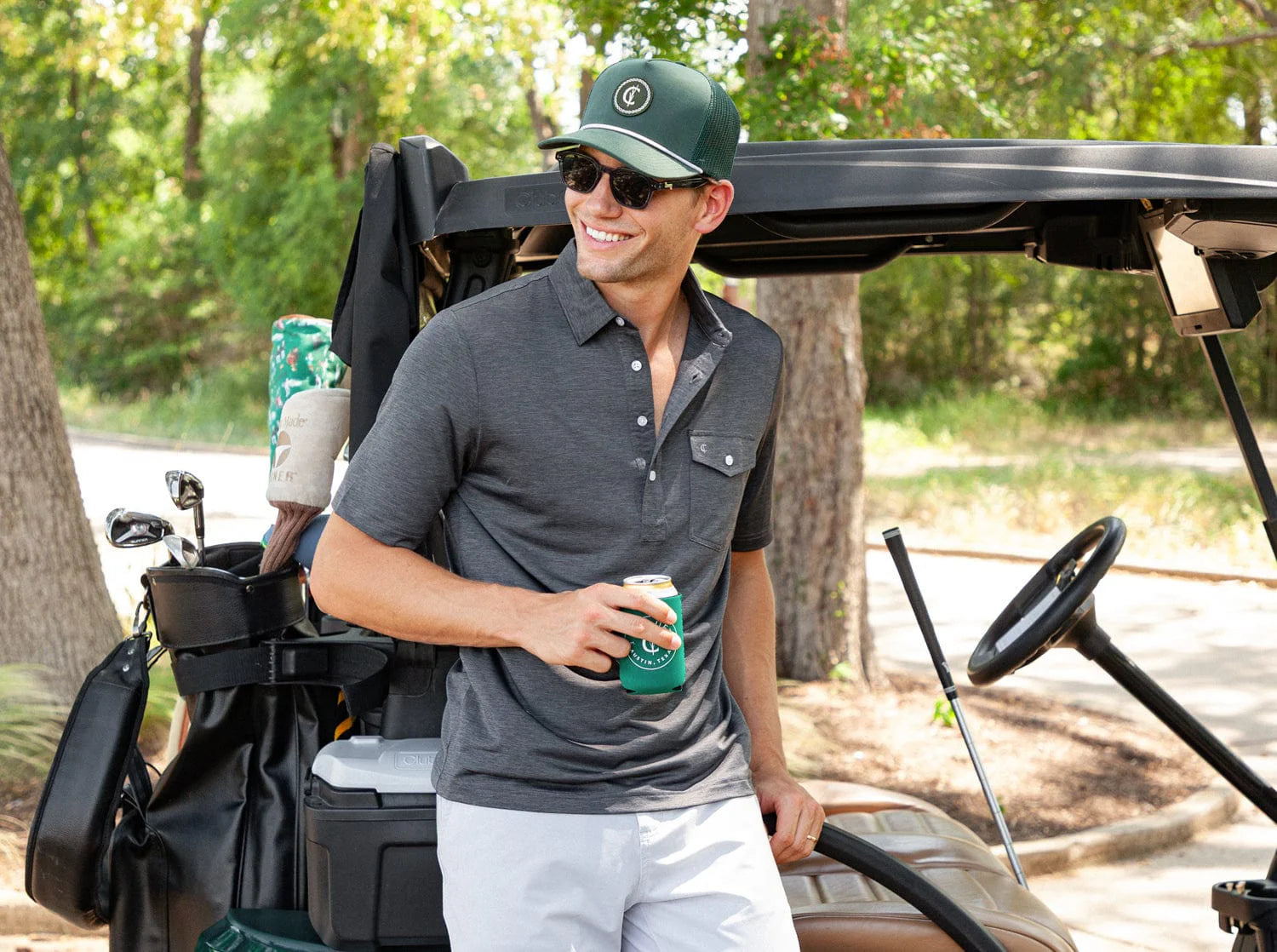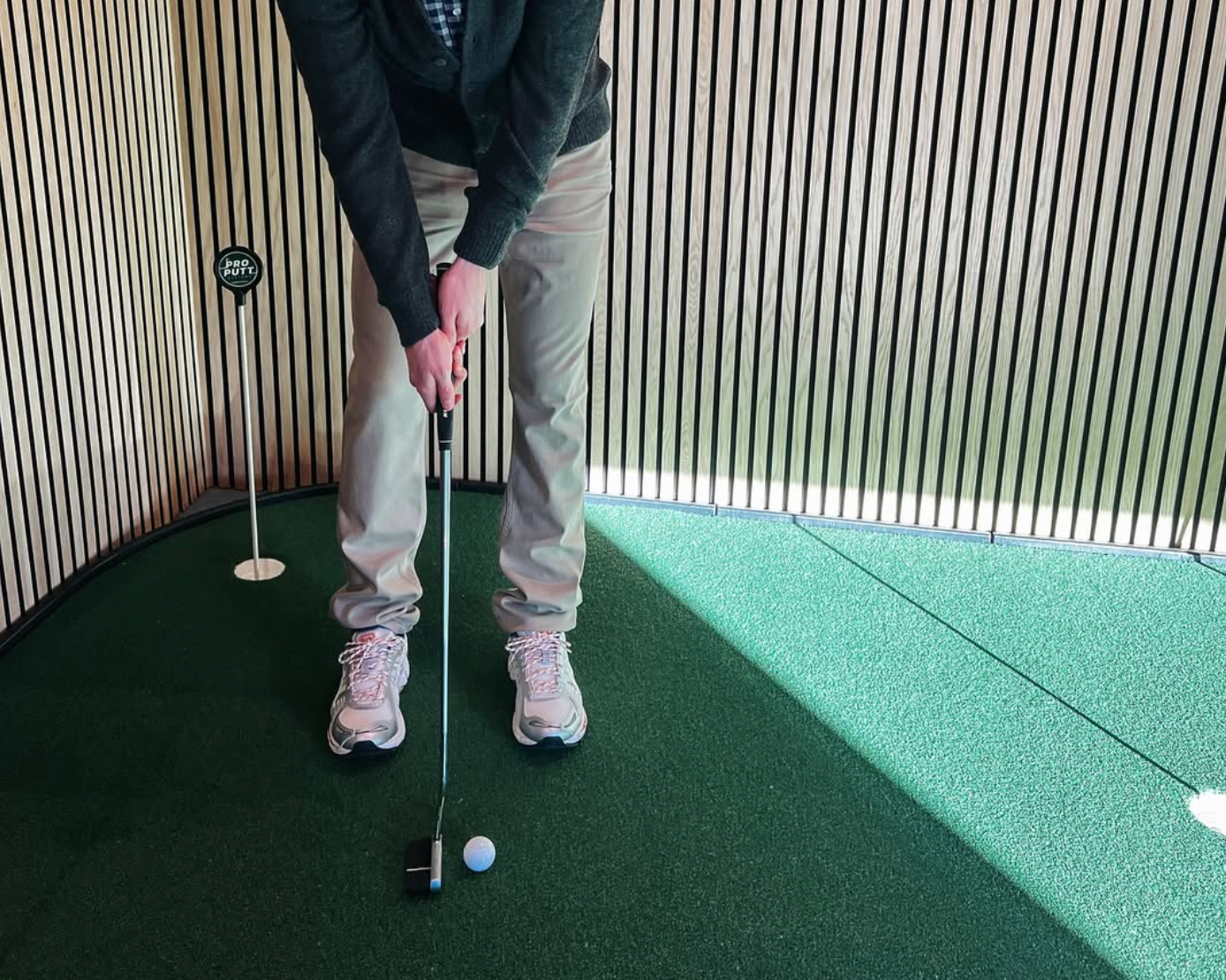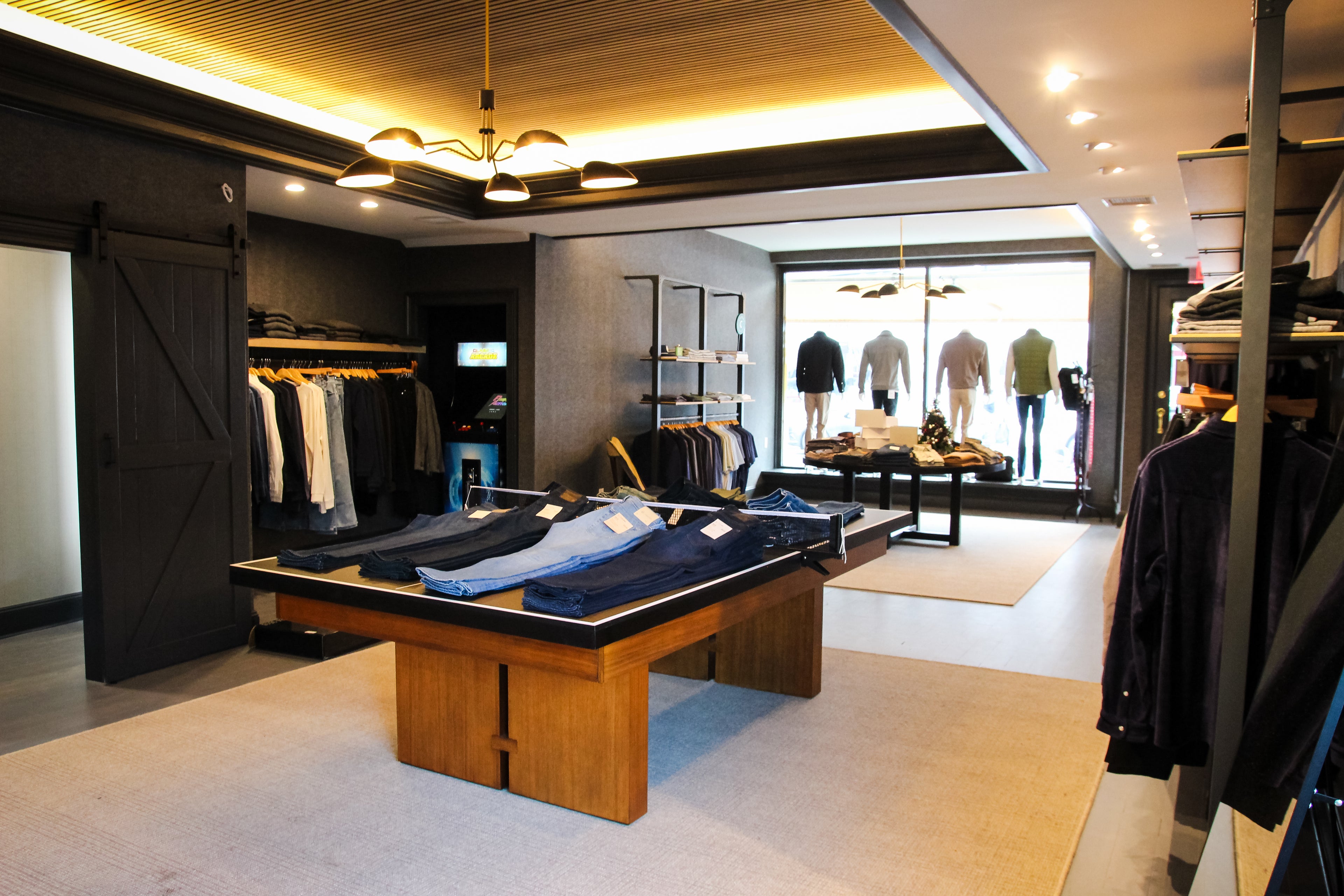 Inspired by her husband’s classic style and love of golf, Gray offers timeless clothing in a relaxed setting, complete with TVs, a putting green, and arcade games.